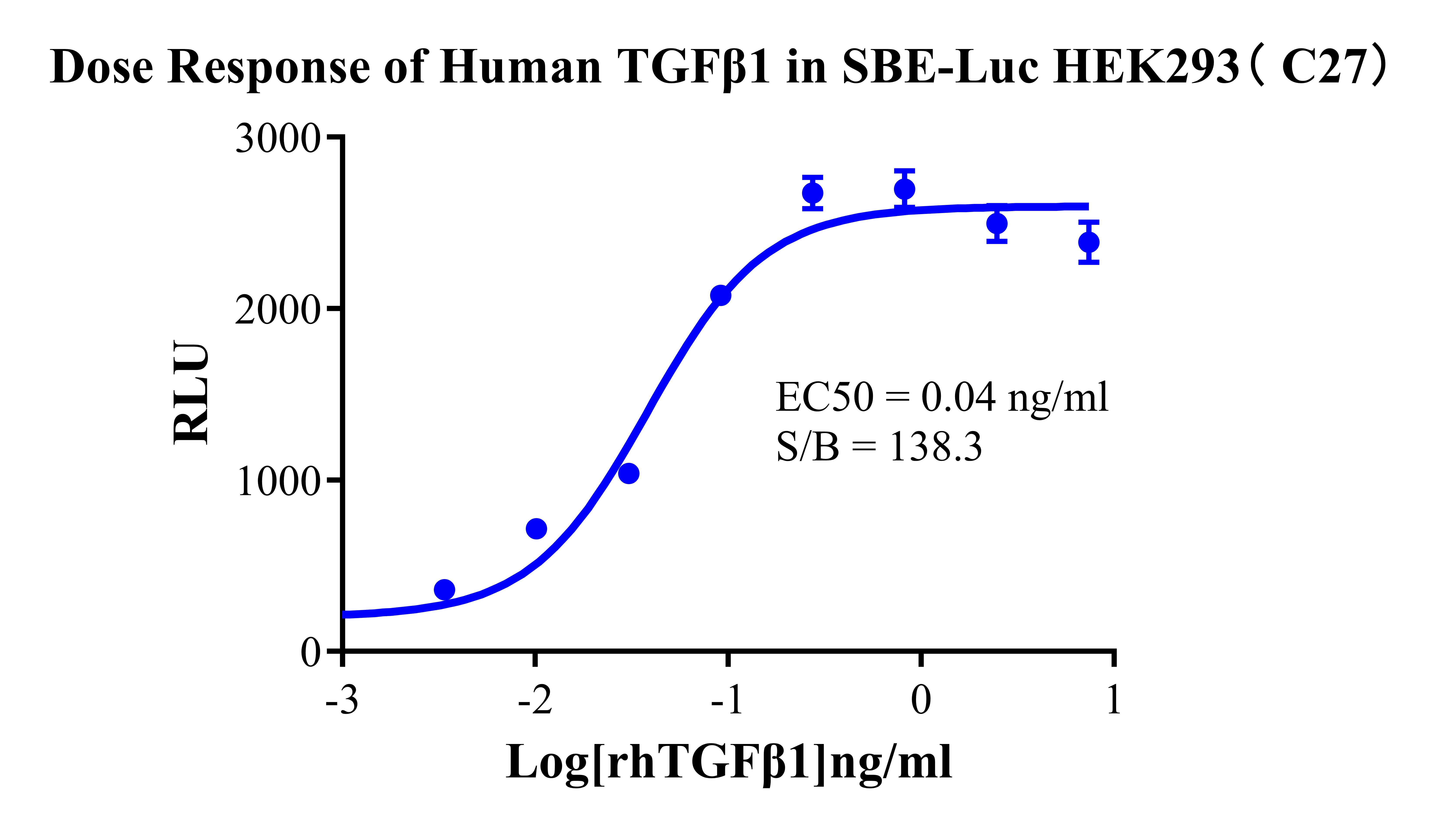 Figure 2. Detect Luciferase assay by Ultra Luciferase Detection Kit CBPH0001(we strongly suggest to purchase from Cobioer). Dose Response of Human TGFβ1 in SBE-Luc HEK293(C27).
