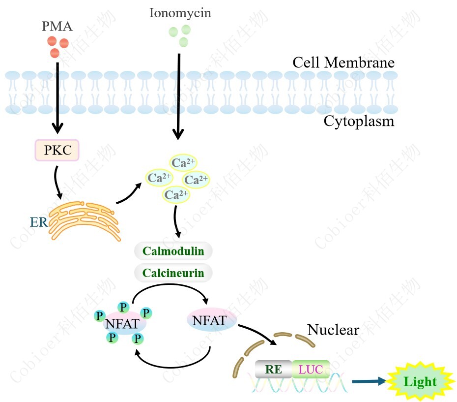 NFAT-Luc THP-1 報(bào)告基因藥靶模型很好的模擬了體內(nèi) NFAT 的信號(hào)轉(zhuǎn)導(dǎo)過程,原理見下圖所示。