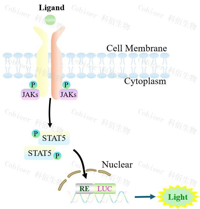 STAT5-Luc BaF3 報告基因細(xì)胞,是由 STAT5 調(diào)控并表達(dá) Luc 熒光素酶 報告基因的 BaF3 細(xì)胞。IL3 與受體結(jié)合,激活 STAT5 的原理見下圖所示。![]() Figure 1. STAT5-Luc BaF3 細(xì)胞模型原理圖 |