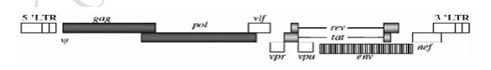 HIV-1為雙鏈RNA病毒,共有9個(gè)基因,如圖1所示。gag、pol、env3個(gè)基因編碼病毒的基本結(jié)構(gòu),tat、rev為調(diào)節(jié)基因,vif、vpr、vpu、nef 4個(gè)為輔助基因。其中,gag基因編碼病毒的核心蛋白,包括基質(zhì)蛋白、衣殼蛋白、核衣殼蛋白;pol基因編碼病毒復(fù)制所需的酶,如反轉(zhuǎn)錄酶、整合酶、蛋白酶,env基因編碼病毒的包膜糖蛋白,決定病毒感染宿主的靶向性。rev編碼的蛋白調(diào)節(jié)gag、pol、env的表達(dá)水平,tat編碼的蛋白參與RNA轉(zhuǎn)錄的控制。4個(gè)輔助基因編碼的蛋白則作為毒力因子參與宿主細(xì)胞的識(shí)別和感染。兩端為長(zhǎng)末端重復(fù)序列(LTR),內(nèi)含復(fù)制所需的順式作用元件,如包裝信號(hào)元件Ψ。