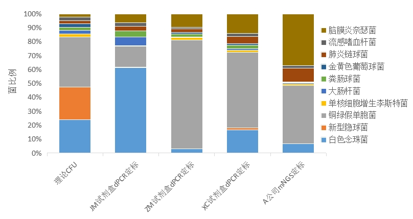 同時(shí),我們也對此產(chǎn)品進(jìn)行了mNGS的檢測,在無差別檢測比對得到的數(shù)據(jù)中,10個(gè)菌都可以檢出,但是比例與數(shù)字PCR也有同樣的差異。