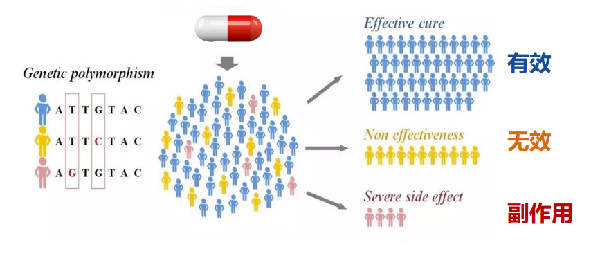 圖1:基因多態(tài)性導(dǎo)致藥物的個體化差異(相同病癥、相同藥物、相同劑量、不同藥效)