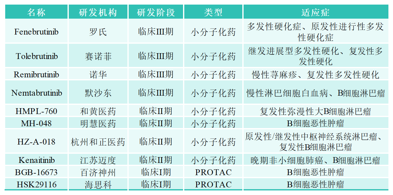 2013年,第一代BTK抑制劑Ibrutinib(伊布替尼)已被批準(zhǔn)用于治療 CLL、MCL、WM 和邊緣區(qū)淋巴瘤 (MZL),它與BTK活性位點(diǎn)的半胱氨酸殘基形成共價(jià)鍵,封閉了ATP結(jié)合口袋,從而阻斷BTK的酶活性。雖然它是一種強(qiáng)效藥物,但它存在脫靶效應(yīng),并且相當(dāng)多的患者對(duì)治療產(chǎn)生耐藥性或毒性而停止治療。第二代的BTK抑制劑(如Acalabrutinib等)在保持高選擇性的同時(shí),減少了脫靶效應(yīng),提高了安全性和療效。但第一代和第二代的抑制劑都屬于不可逆抑制劑。BTK共價(jià)抑制劑治療后常會(huì)產(chǎn)生耐藥,部分耐藥機(jī)制為BTK 基因產(chǎn)生耐藥突變導(dǎo)致,其中最常見的耐藥突變?yōu)镃481位的氨基酸突變?yōu)镾。Pirtobrutinib是由禮來研發(fā)的首款獲批上市的非共價(jià)的第三代BTK抑制劑,它通過非共價(jià)、非C481依賴的結(jié)合阻斷BTK的ATP結(jié)合位點(diǎn),從而克服由C481S導(dǎo)致的共價(jià)BTK抑制劑耐藥機(jī)制,另外包括fenebrutinib,Nemtabrutinib等也屬于同一類型的三代非共價(jià)抑制劑。除了上述共價(jià)或非共價(jià)BTK抑制劑外,為了進(jìn)一步提高藥效和克服耐藥,近年來一些藥企也在開發(fā)針對(duì)BTK靶點(diǎn)的PROTAC藥物,下表為部分在研的BTK抑制劑以及PROTAC藥物。