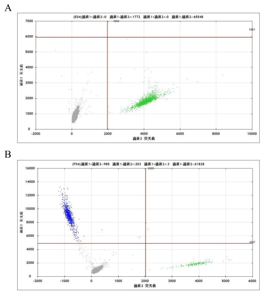 Figure 4:Gene Edited BTK[C481S] Isogenic Cell-ddPCR結(jié)果(通道1 藍(lán)色微滴代表BTK C481S 突變陽(yáng)性,通道2 綠色微滴代表該位點(diǎn)為陰性野生型)