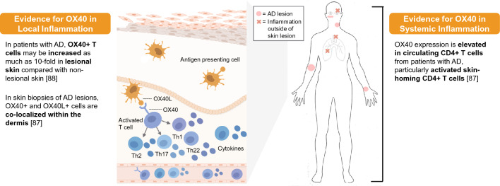 有研究證明OX40通路的激活參與了AD患者的全身和局部炎癥(如下圖所示)。雖然OX40L的表達(dá)(主要是單核細(xì)胞)在AD患者和健康對照組之間沒有差異,但在AD患者循環(huán)CD4+ T細(xì)胞中OX40的表達(dá)升高。在AD患者的外周血中,活化的CD4+ T細(xì)胞上OX40的表達(dá)比未表達(dá)抗原的活化CD4+ T細(xì)胞上OX40的表達(dá)增加。AD患者病變皮膚中OX40+細(xì)胞(可能是T細(xì)胞)和OX40L+樹突狀細(xì)胞的數(shù)量比銀屑病和非病變皮膚多。一項(xiàng)研究表明,在AD患者中,皮損皮膚中OX40+ T細(xì)胞比非皮損皮膚增加了10倍之多。在AD病變的皮膚活檢中,發(fā)現(xiàn)OX40+真皮細(xì)胞和OX40L+細(xì)胞(可能是肥大細(xì)胞)在真皮內(nèi)共定位,在角質(zhì)形成細(xì)胞上可見OX40L的表達(dá),提示OX40信號(hào)的局部活性。