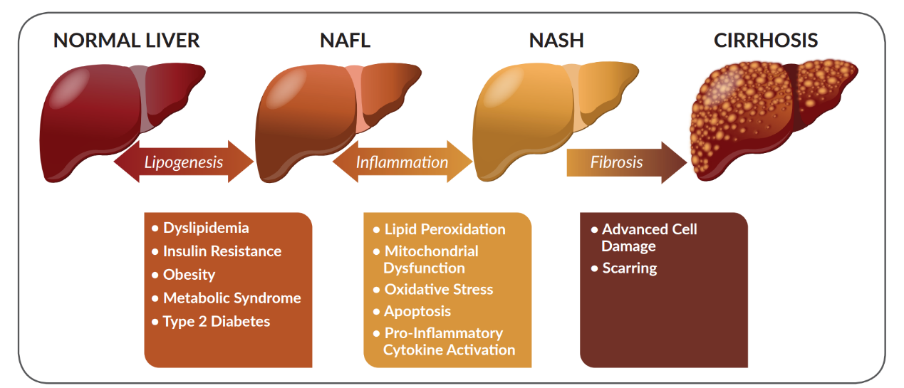 非酒精性脂肪性肝炎(NASH)是非酒精性脂肪肝?。∟AFLD)的嚴(yán)重形式,伴隨肝臟炎癥、脂肪堆積和纖維化,可進(jìn)展為肝硬化甚至肝癌。全球約 25% 成人患有非酒精性脂肪肝?。∟AFLD),其中20%-30% 會(huì)進(jìn)展為非酒精性脂肪性肝炎(NASH)。