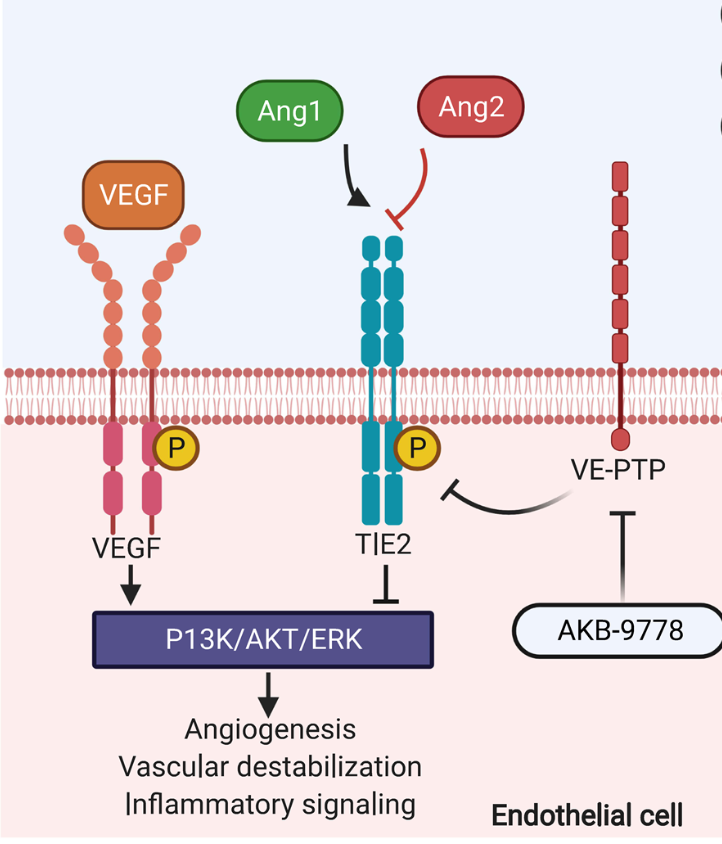 血管生成素蛋白家族由 血管生成素1(Ang1)、血管生成素2(Ang2)、血管生成素3(Ang3) 和血管生成素4(Ang4) 組成。Ang1和Ang2是Tie2的主要配體,Tie2是一種內(nèi)皮細(xì)胞特異性受體酪氨酸激酶。Tie2在血管生成素激活后經(jīng)歷特異性亞細(xì)胞定位。這種定位有助于區(qū)分靜止內(nèi)皮和血管生成內(nèi)皮之間的信號轉(zhuǎn)導(dǎo)結(jié)果。在運(yùn)動的血管生成內(nèi)皮中,基質(zhì)結(jié)合的Ang1與Tie2結(jié)合并將其定位于細(xì)胞-細(xì)胞外基質(zhì)接觸,并繼續(xù)進(jìn)行細(xì)胞遷移和增殖過程。在靜止內(nèi)皮中,Ang1/Tie2 信號轉(zhuǎn)導(dǎo)將匯合內(nèi)皮細(xì)胞上的Tie2轉(zhuǎn)位到內(nèi)皮細(xì)胞-內(nèi)皮細(xì)胞連接處的簇中,并誘導(dǎo)促存活、內(nèi)皮緊密連接穩(wěn)定和抗炎信號。這主要是通過下游募集和激活PI3K以及隨后的Akt磷酸化來實(shí)現(xiàn)的。Akt信號轉(zhuǎn)導(dǎo)通過上調(diào)促存活分子(包括磷酸化內(nèi)皮一氧化氮合酶(eNOS) 和存活素表達(dá))來促進(jìn)內(nèi)皮細(xì)胞存活,同時抑制凋亡途徑,例如 caspase-9 和 B 細(xì)胞淋巴瘤 2 (BCL2) 相關(guān)細(xì)胞死亡激動劑 (BAD)。