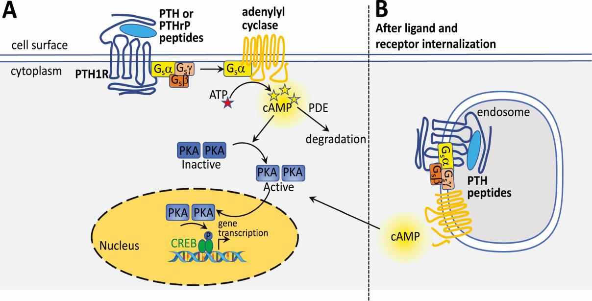 PTH1R的核心結(jié)構(gòu)包括N端胞外結(jié)構(gòu)域(ECD)、7次跨膜結(jié)構(gòu)域(7TMD,由七個(gè)跨膜α螺旋和連接環(huán)組成)和C端胞內(nèi)結(jié)構(gòu)域。PTH 或 PTHrP 的氨基末端肽與PTH1R的ECD結(jié)合后,會導(dǎo)致 G 蛋白的激活,主要是 Gα,它激活腺苷酸環(huán)化酶,并以磷酸二酯酶限制的方式催化 cAMP 的產(chǎn)生。當(dāng)達(dá)到足夠的局部細(xì)胞內(nèi)濃度時(shí),cAMP 激活 PKA,PKA 易位到細(xì)胞核,在核內(nèi)磷酸化 CREB,從而能夠在特定基因上轉(zhuǎn)錄 cAMP 響應(yīng)元件,從而調(diào)控成骨細(xì)胞分化和鈣磷代謝。PTH1R 信號傳導(dǎo)可以發(fā)生在細(xì)胞表面,或者對于 PTH 氨基末端肽,它也可以發(fā)生在配體和受體內(nèi)化后。