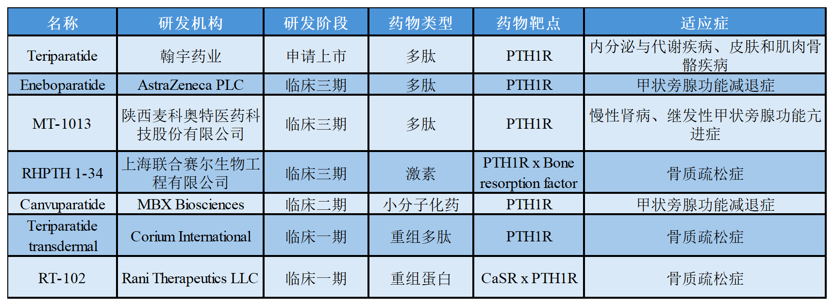 關(guān)于PTH1R在研的部分藥物進(jìn)展如下表所示: