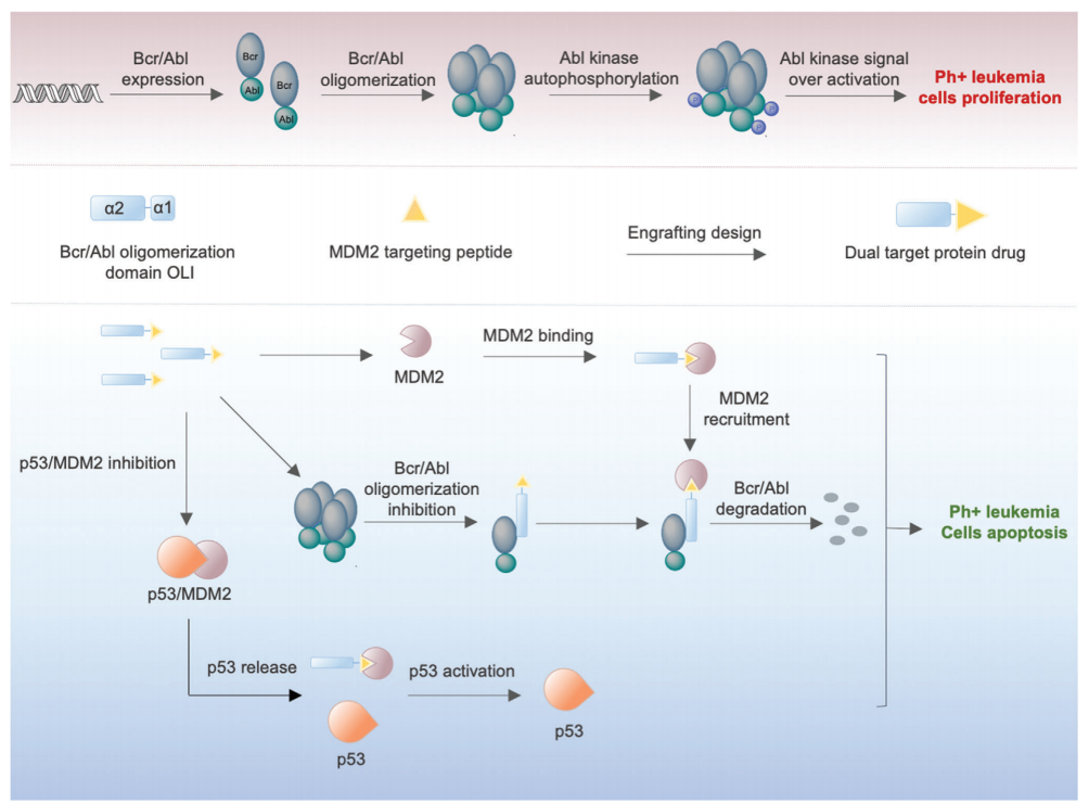 Bcr/Abl在費城染色體陽性(Ph+)白血病中起著核心作用,因為它構(gòu)成激活Abl酪氨酸激酶及其下游通路。目前,使用酪氨酸激酶抑制劑對伊馬替尼耐藥患者的臨床治療受到耐藥性和不良反應的嚴重限制。在本研究中,通過將MDM2/p53抑制肽序列移植到Bcr/Abl四聚化結(jié)構(gòu)域,設(shè)計了一種雙靶向蛋白水解靶向嵌合體(PROTAC)蛋白藥物,稱為PMIBcr/Abl-R6。PMIBcr/Abl-R6具有Bcr/Abl靶向序列和MDM2結(jié)合序列,在Ph+白血病細胞中作為PROTAC藥物。其雙靶向結(jié)構(gòu)表明,PMIBcr/Abl-R6設(shè)計靶向四聚化結(jié)構(gòu)域而不是Abl激酶結(jié)構(gòu)域,因此有可能克服激酶結(jié)構(gòu)域的耐藥突變。PMIBcr/Abl-R6的有效能力可以同時誘導Bcr/Abl降解并激活p53通路。PMIBcr/Abl-R6具有通過多種機制克服Ph+白血病的耐藥性的潛力。