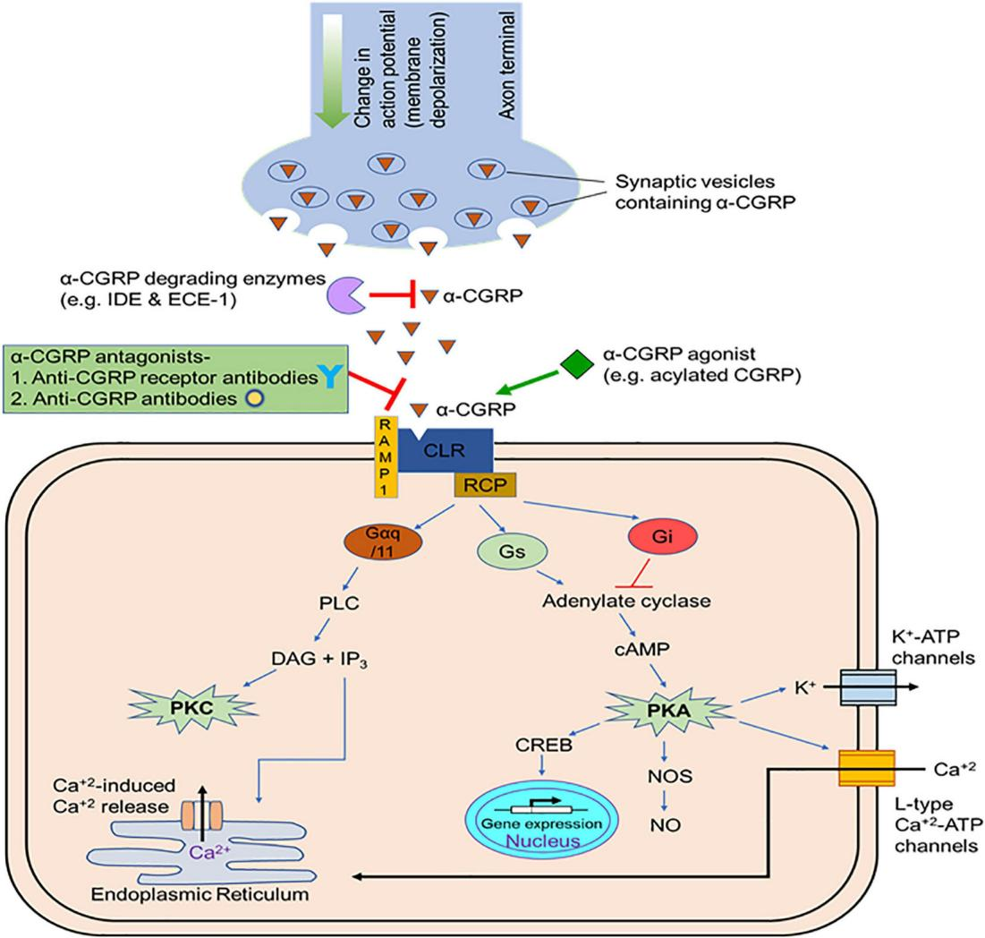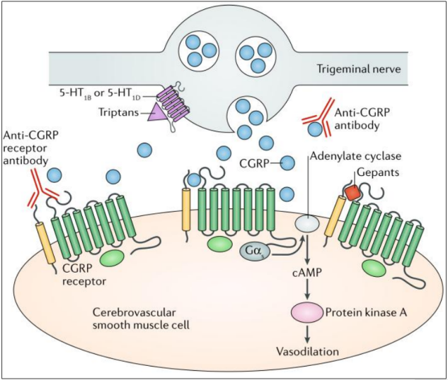 降鈣素基因相關(guān)肽(calcitonin gene-related peptid,CGRP)是一個(gè)含有37個(gè)氨基酸殘基的感覺(jué)神經(jīng)源性多肽,分為α-CGRP和β-CGRP兩個(gè)亞型,廣泛分布于中樞神經(jīng)系統(tǒng)(主要是三叉神經(jīng)血管系統(tǒng)、丘腦和小腦)。CGRP是一種強(qiáng)效的血管擴(kuò)張劑,它主要由感覺(jué)神經(jīng)(如三叉神經(jīng))釋放。CGRP釋放后與腦血管平滑肌細(xì)胞表面的CGRP受體結(jié)合,引起腦血管擴(kuò)張。CGRP受體的結(jié)構(gòu)主要包括:降鈣素受體樣受體(CALCRL)、活性修飾蛋白受體(RAMP)及結(jié)構(gòu)蛋白受體(RCP)。CGRP受體復(fù)合物是一種G蛋白偶聯(lián)受體,通過(guò)激活蛋白激酶A系統(tǒng),參與疼痛信息的病理調(diào)控過(guò)程。
