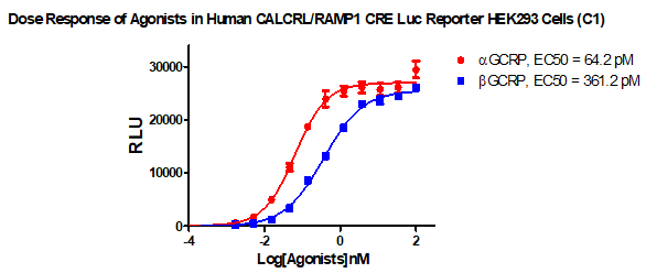 針對(duì)CGRP靶點(diǎn)藥物開(kāi)發(fā)研究的需求,科佰生物開(kāi)發(fā)了CALCRL/RAMP1/CRE-Luc/HEK293藥篩細(xì)胞模型,歡迎來(lái)電咨詢(xún)。部分?jǐn)?shù)據(jù)展示如下: