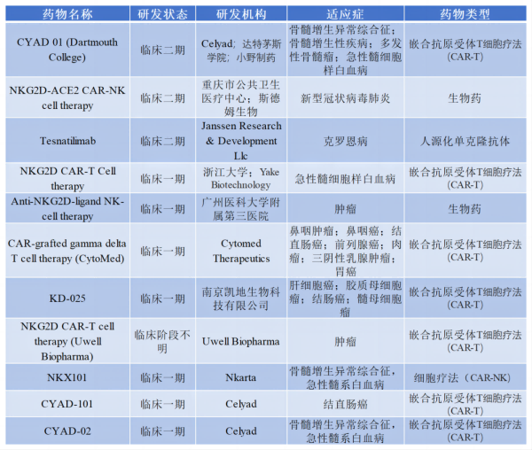 截至目前,全球有11種針對NKG2D的在研藥物,主要集中在臨床早期,其中以CAR-T細(xì)胞療法為作用機(jī)制的就有10種。而CAR-NK療法因為沒有發(fā)現(xiàn)細(xì)胞因子釋放綜合癥及神經(jīng)毒性等副作用,因而比CAR-T療法具有優(yōu)勢,這可能是由于NK細(xì)胞本身不容易導(dǎo)致過高的細(xì)胞因子分泌。除此之外CAR-NK療法不需要以患者的自體免疫細(xì)胞作為來源、治療成本更低等優(yōu)勢可能使它成為CAR-T療法的一大競爭對手。除抗腫瘤藥物外,強(qiáng)生旗下的楊森公司針對該靶點在自身免疫疾病方面的作用開發(fā)了一款單抗類藥物,通過抑制該靶點活性來降低克羅恩病患者的炎癥反應(yīng)。