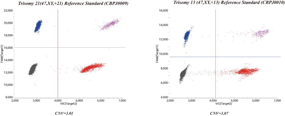 Fig 2. Results of ddPCR with Trisomy 21 (47,XY,+21) Reference Standard and Trisomy 13 (47,XY,+13) Reference Standard.