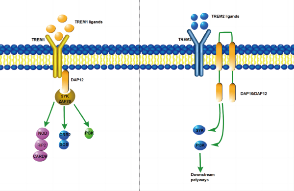 TREM(Triggering receptor expressed on myeloid cells)家族屬于細(xì)胞表面受體,介導(dǎo)調(diào)控炎癥反應(yīng)。TREM1屬于髓系細(xì)胞表面受體,在多種腫瘤微環(huán)境中均表達(dá),協(xié)同經(jīng)典的模式識(shí)別受體(PRR),例如Toll-like受體(TLR)家族和Nod-like受體(NLR)家族,在宿主防御中放大由微生物成分介導(dǎo)的炎癥反應(yīng),具有抗腫瘤的作用。TREM2(Triggering receptor expressed on myeloid cells-2)是免疫球蛋白超家族的跨膜受體,僅在中樞神經(jīng)系統(tǒng)(CNS)的小膠質(zhì)細(xì)胞等骨髓細(xì)胞中表達(dá)。TREM2有多種配體,主要有APOE, HDL, LDL以及Aβ等。TREM2通過(guò)其與接頭蛋白DAP12和DAP10的關(guān)聯(lián)發(fā)出信號(hào)。DAP12是參與先天免疫應(yīng)答的細(xì)胞中表達(dá)的信號(hào)傳導(dǎo)銜接蛋白,介導(dǎo)脾酪氨酸激酶SYK的激活,DAP12促進(jìn)質(zhì)膜上TREM2的穩(wěn)定,可以調(diào)控細(xì)胞的增殖,生存以及炎癥等信號(hào)通路。TREM2還可以結(jié)合DAP10,而DAP10通過(guò)招募磷脂酰肌醇3-激酶(PI3K)促進(jìn)信號(hào)傳導(dǎo)。