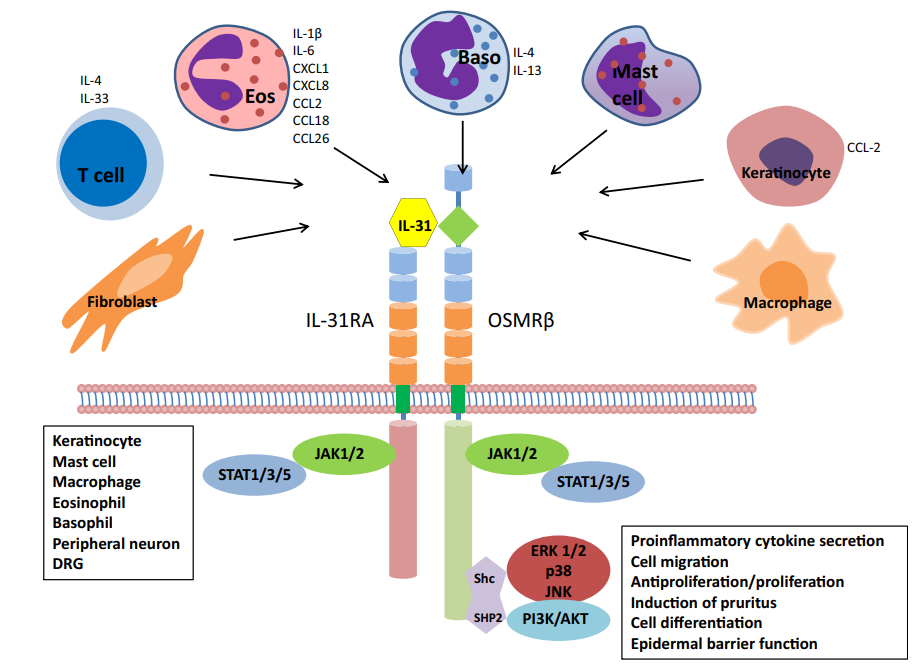 IL-31(白細(xì)胞介素31)于2004年被Dillon等人發(fā)現(xiàn),是一種四螺旋束細(xì)胞因子,有2個(gè)長(zhǎng)螺旋和2個(gè)短螺旋,屬于糖蛋白130 (gp130)/IL-6細(xì)胞因子家族。IL-31最初被證明是由激活的輔助T細(xì)胞產(chǎn)生的,尤其是Th2細(xì)胞、肥大細(xì)胞、巨噬細(xì)胞和樹突狀細(xì)胞,此外在嗜酸性粒細(xì)胞、嗜堿性細(xì)胞等中也有IL-31的表達(dá)。IL-31與瘙癢感覺神經(jīng)纖維表面IL-31RA亞基結(jié)合,激活OSMR亞基發(fā)生異構(gòu),主要通過磷脂酰肌醇30-激酶/蛋白激酶(PI3K/AKT)通路、Janus激酶/信號(hào)轉(zhuǎn)換器和轉(zhuǎn)錄激活因子(JAK/STAT)通路及絲裂原激活的蛋白激酶(Ras/Raf/MAPK)通路。IL-31信號(hào)通路的下游轉(zhuǎn)錄因子的激活會(huì)參與不同的基因表達(dá),比如炎癥、遷移、分化、(抗)增殖、細(xì)胞存活和屏障功能等。