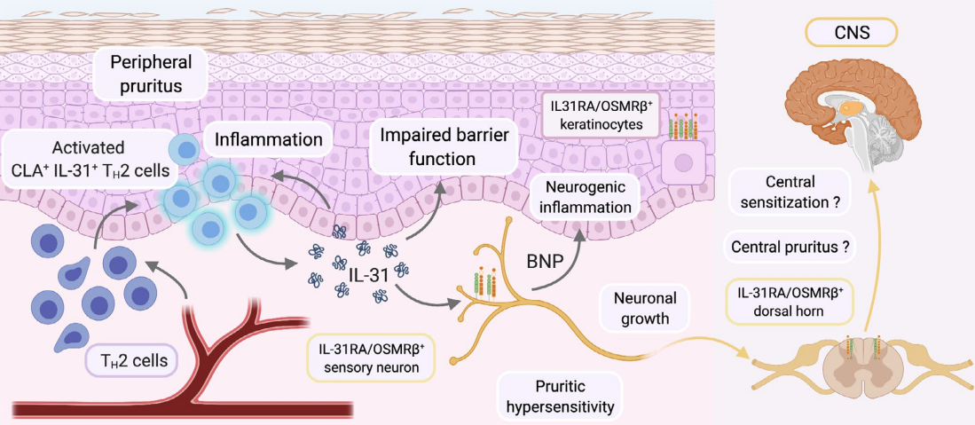 CLA T2細(xì)胞是特應(yīng)性皮炎(AD)患者循環(huán)中豐富的過敏原反應(yīng)性T細(xì)胞,通過CCL17和CCL22信號(hào)被募集到AD感染的皮膚。在皮膚中,CLA T2細(xì)胞分泌IL-31,進(jìn)而激活表達(dá)IL31RA/ OSMR β-的皮膚感覺神經(jīng)、天然免疫細(xì)胞(包括DC)、單核細(xì)胞和嗜酸性粒細(xì)胞以及角質(zhì)形成細(xì)胞。在AD皮膚中,角質(zhì)形成細(xì)胞顯示IL31RA/OSMRβ表達(dá)水平升高,導(dǎo)致對(duì)IL-31的接受性增強(qiáng)。皮膚IL-31信號(hào)通過IL-31介導(dǎo)的終分化基因(如聚絲蛋白和脂質(zhì)包膜減少)的抑制,導(dǎo)致外周瘙癢、(神經(jīng))炎癥和屏障功能受損?;罨慕琴|(zhì)形成細(xì)胞分泌各種化學(xué)引誘劑,觸發(fā)表達(dá)IL -31的CLA Tu2細(xì)胞額外募集到炎癥部位,形成皮膚炎癥和瘙癢的反饋循環(huán)。人和犬的感覺神經(jīng)元表達(dá)IL31RA/ OSMRβ主要在TRPV1共表達(dá)的神經(jīng)元中。IL-31與IL31RA/ OSMR β結(jié)合后,通過下游信號(hào)通路上調(diào)瞬時(shí)受體電位香草酸受體1(tansient receptor potential vanilloid,TRPV1)及瞬時(shí)受體電位受體A1(TRPA1)表達(dá),增強(qiáng)神經(jīng)元興奮性,促進(jìn)晚期及慢性瘙癢形成。