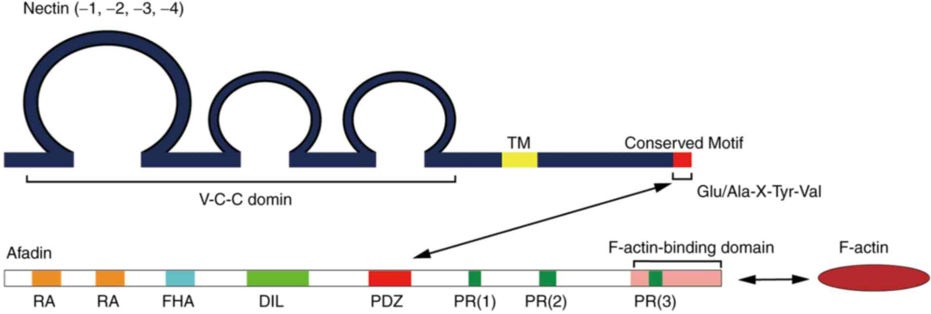 胞質(zhì)尾的C端都包含一個afadin (一種 F-肌動蛋白結(jié)合蛋白)結(jié)合基序,與Nectin-4不同的是,Nectin-1、Nectin-2、Nectin-3的afadin結(jié)合基序都是保守序列 Glu/Ala-X-Tyr-Val,可與 afadin的PDZ 結(jié)構(gòu)域結(jié)合;而Nectin-4可通過其C末端的 Gly-His-Leu-Val 基序與銜接分子afadin結(jié)合。當(dāng)Nectins與銜接分子afadin結(jié)合后,afadin會結(jié)合并募集絲狀肌動蛋白組件 (F-actin),從而促進細(xì)胞與細(xì)胞之間的粘附。Nectin家族與鈣黏著蛋白共同作用,對粘著連接和緊密連接的產(chǎn)生和維持具有顯著影響,它們調(diào)節(jié)多種細(xì)胞行為,包括細(xì)胞粘附、生長、分化、遷移和凋亡。