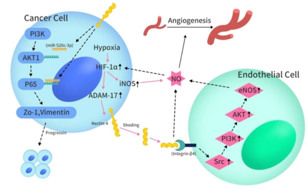 Nectin-4在正常的胚胎和胎兒組織中含量很高,但成年人的正常組織中通常表達(dá)較低,且在各種癌細(xì)胞上表達(dá)較高,比如宮頸癌、尿路上皮癌、乳腺癌、肺癌、胃癌、頭頸癌、胰腺癌等,主要通過激活PI3K/Akt途徑促進腫瘤細(xì)胞增殖、分化、遷移、侵襲等。