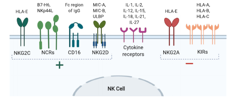 NKG2A/CD94受體與肽呈遞HLA-E結(jié)合可導(dǎo)致NKG2A中ITIMs的磷酸化。磷酸化的ITIMs負責(zé)募集和激活細胞內(nèi)磷酸酶SHP-1和SHP-2,從而抑制激活T細胞受體(TCR)和NKG2D等受體產(chǎn)生的激活信號。經(jīng)典的HLA分子通常會丟失,與之相反,HLA- E在腫瘤細胞中的表達通常會升高。NKG2A和HLA-E之間的相互作用有助于腫瘤免疫逃逸,NKG2A介導(dǎo)的機制目前被用來開發(fā)潛在的抗腫瘤治療策略。此外,破壞NKG2A與其配體的相互作用被證明可有效增強抗腫瘤免疫應(yīng)答。